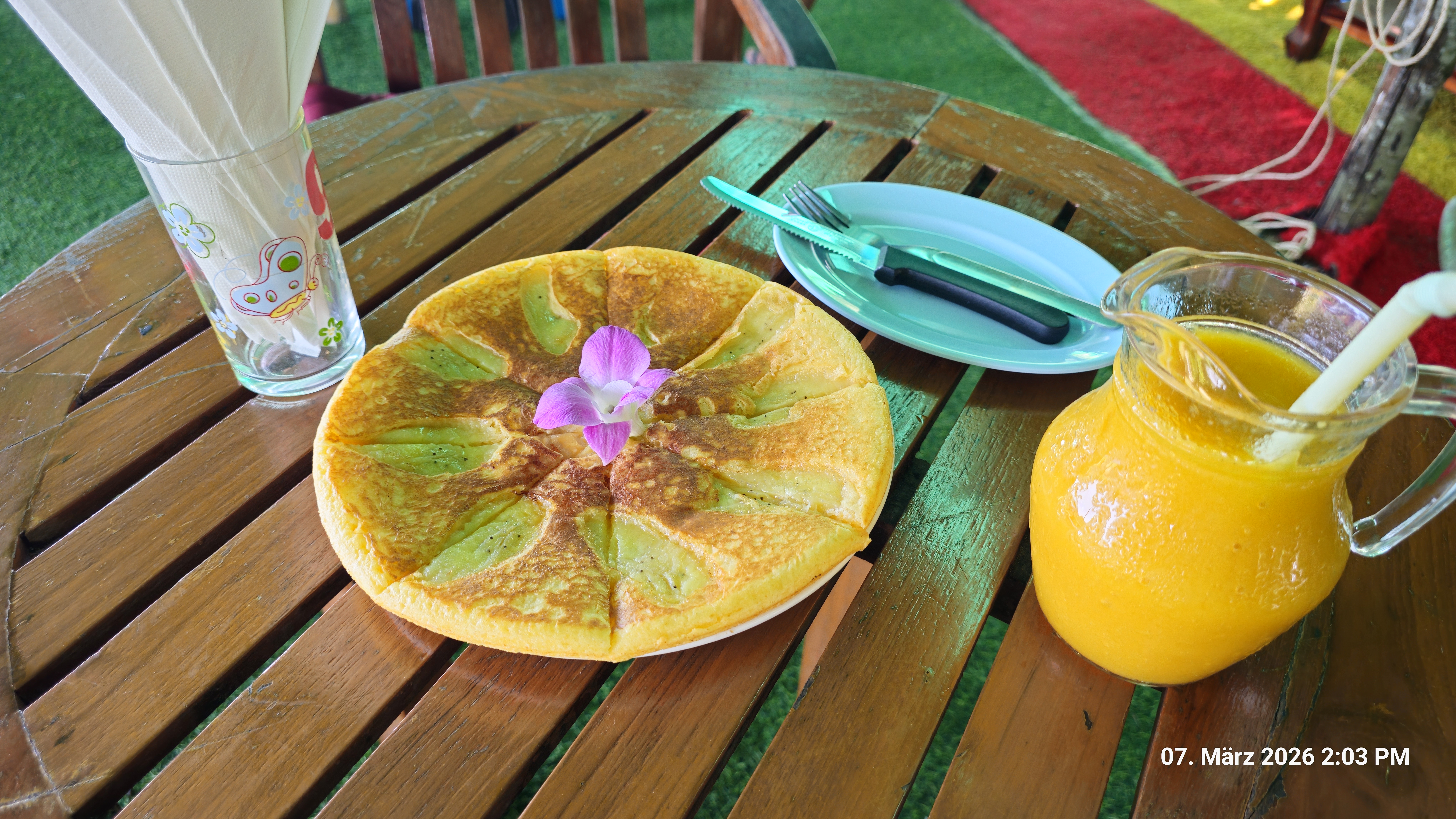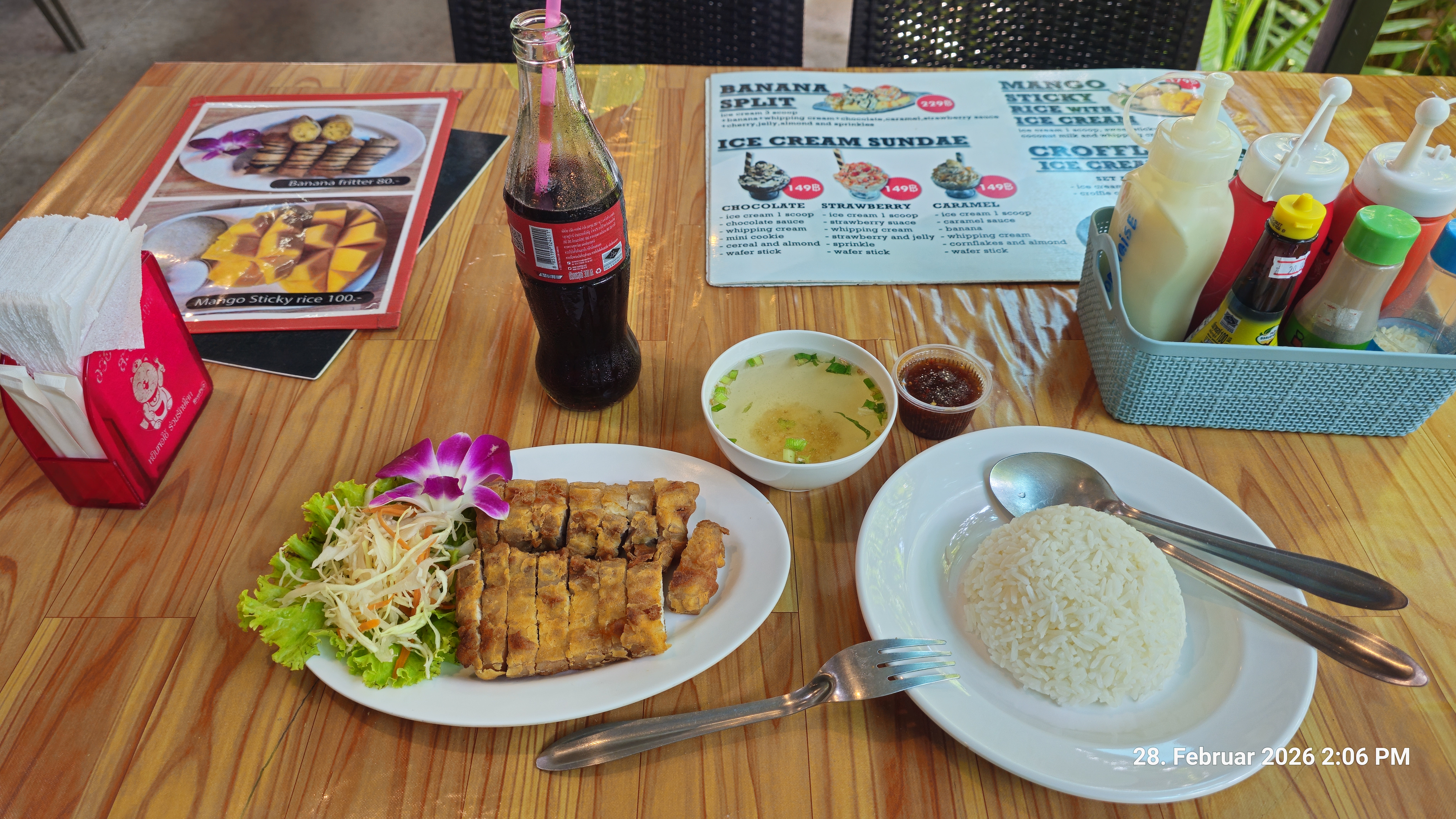 Ich habe Pankace Banana bestellt, also Banenen Pfannkuchen. Die tun meinem Magen glaube ich auch ganz gut, ich habe ja seit dem 3. März nichts mehr gegessen ausser trockene Kekse.