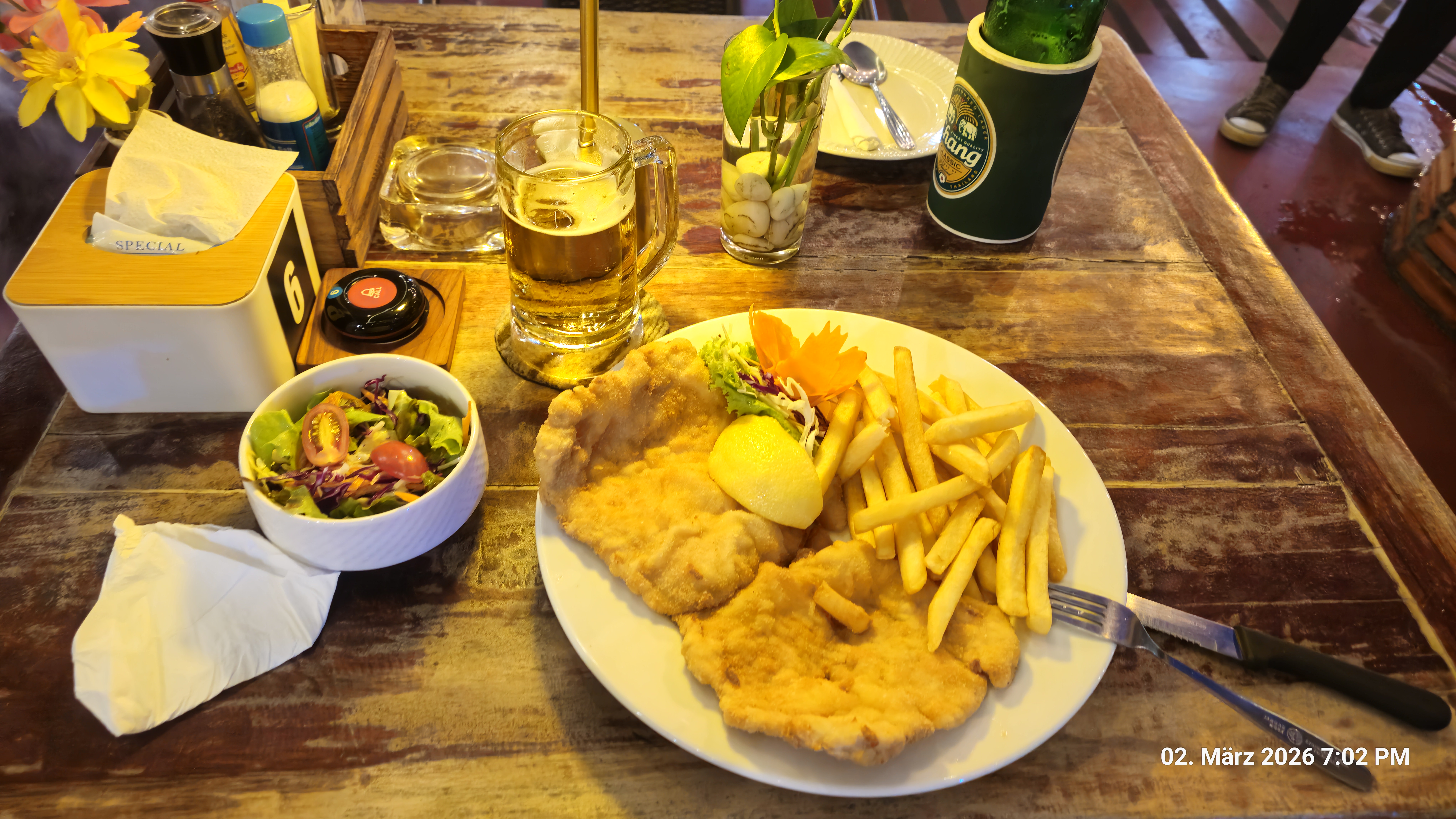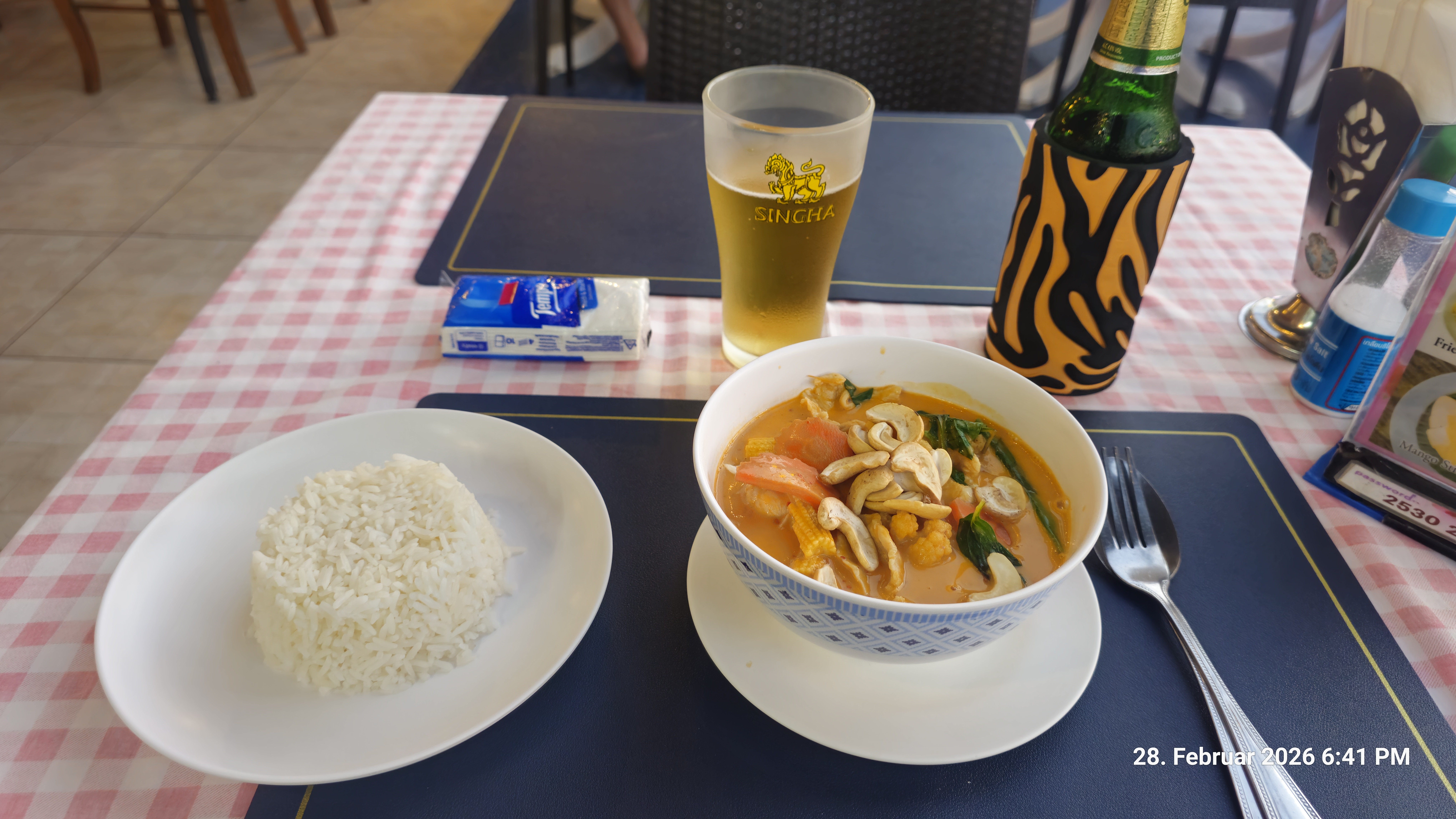 Ich habe ein Curry bestellt und ein kleines Chang Bier dazu getrunken.