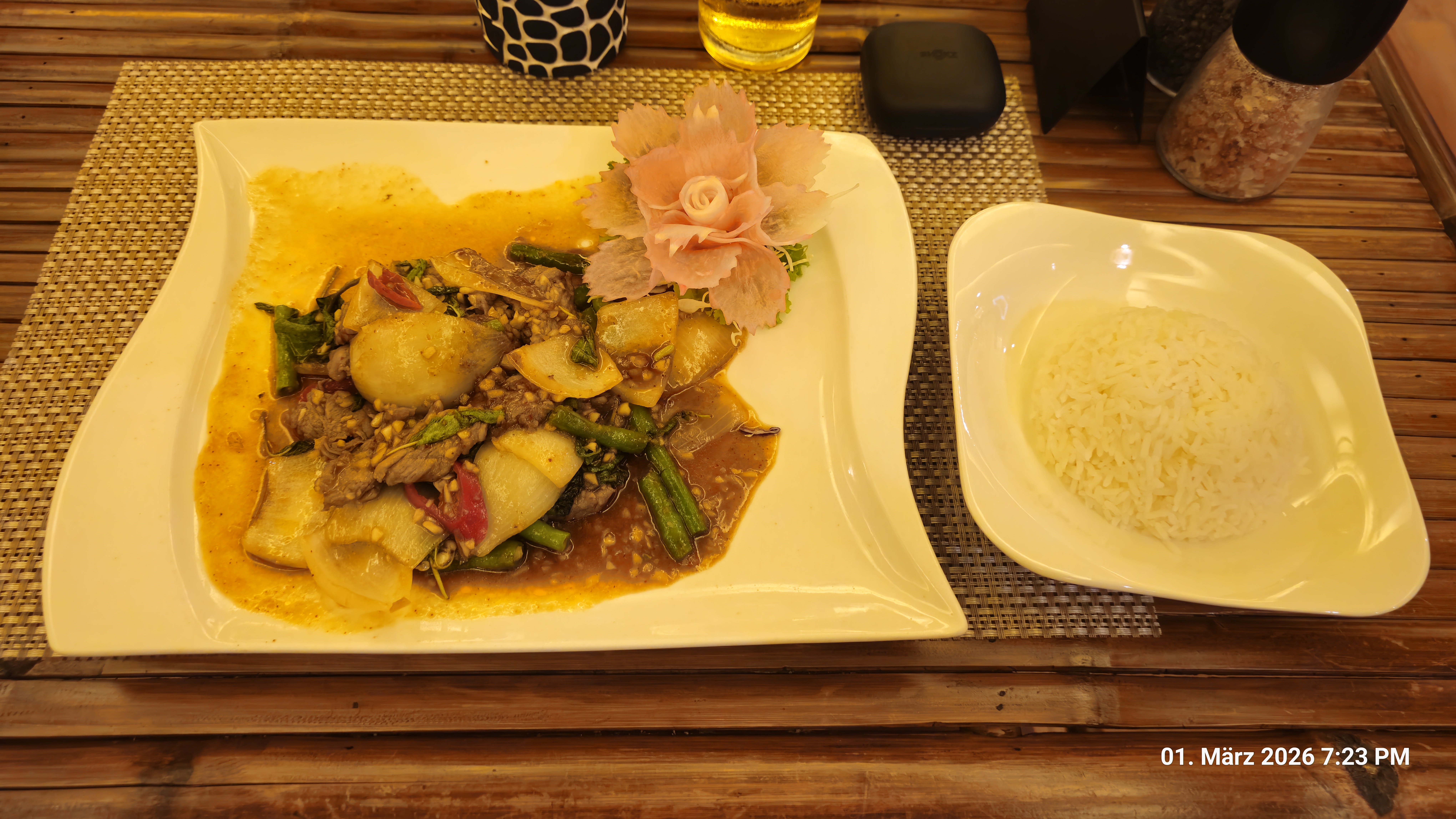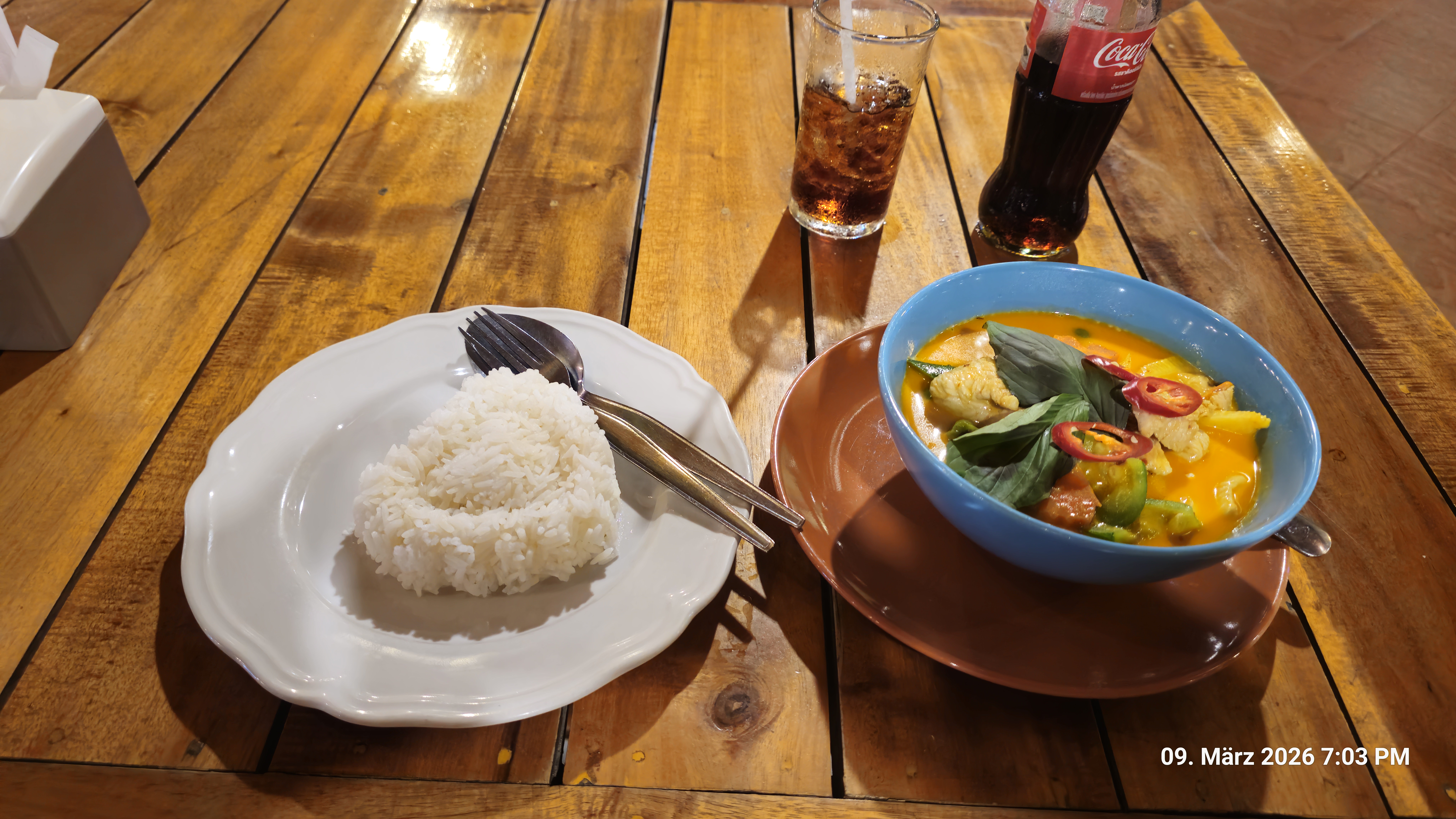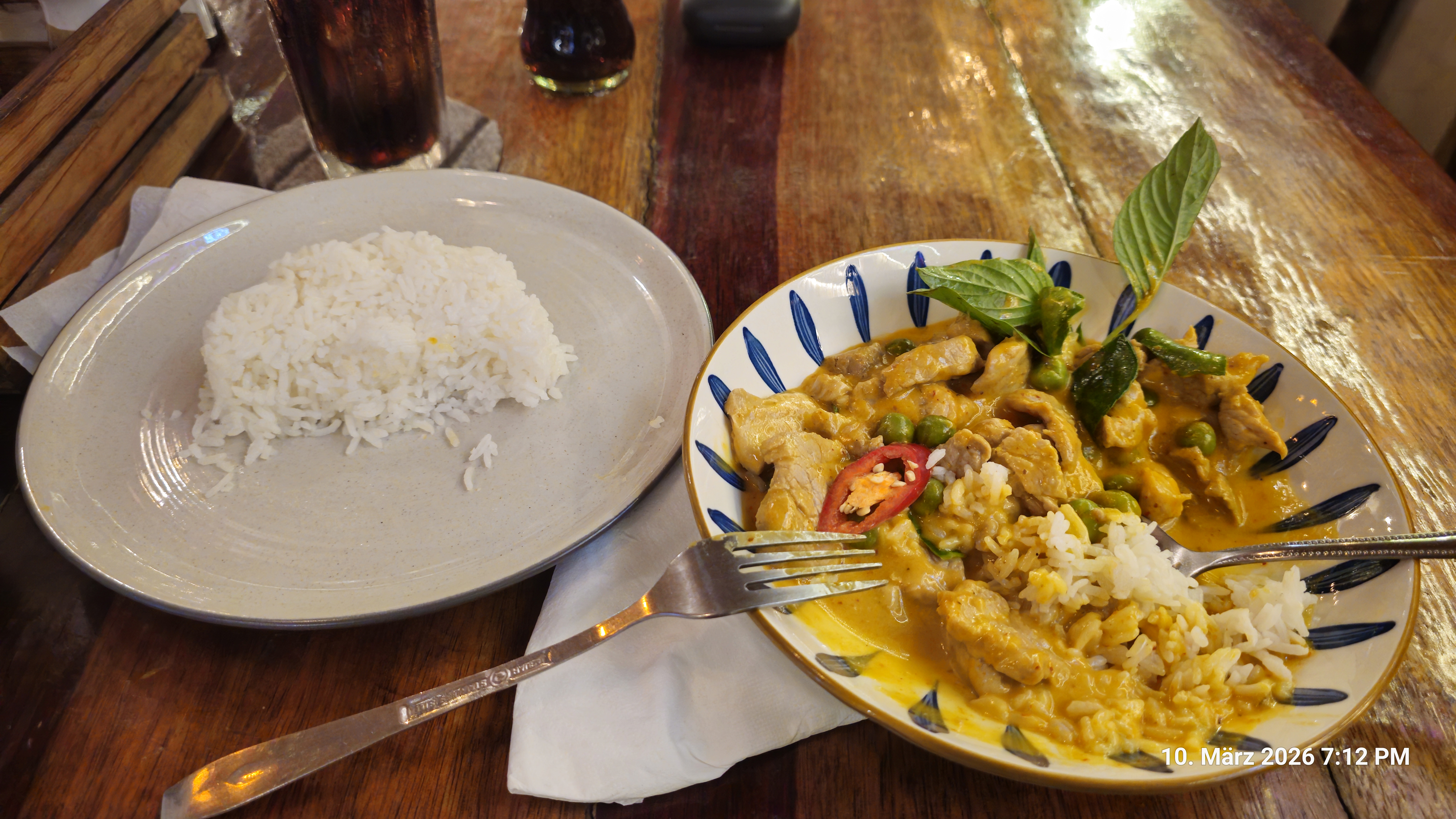 Während ich mein Panang Curry serviert bekam fing es an kräftige zu regnen.