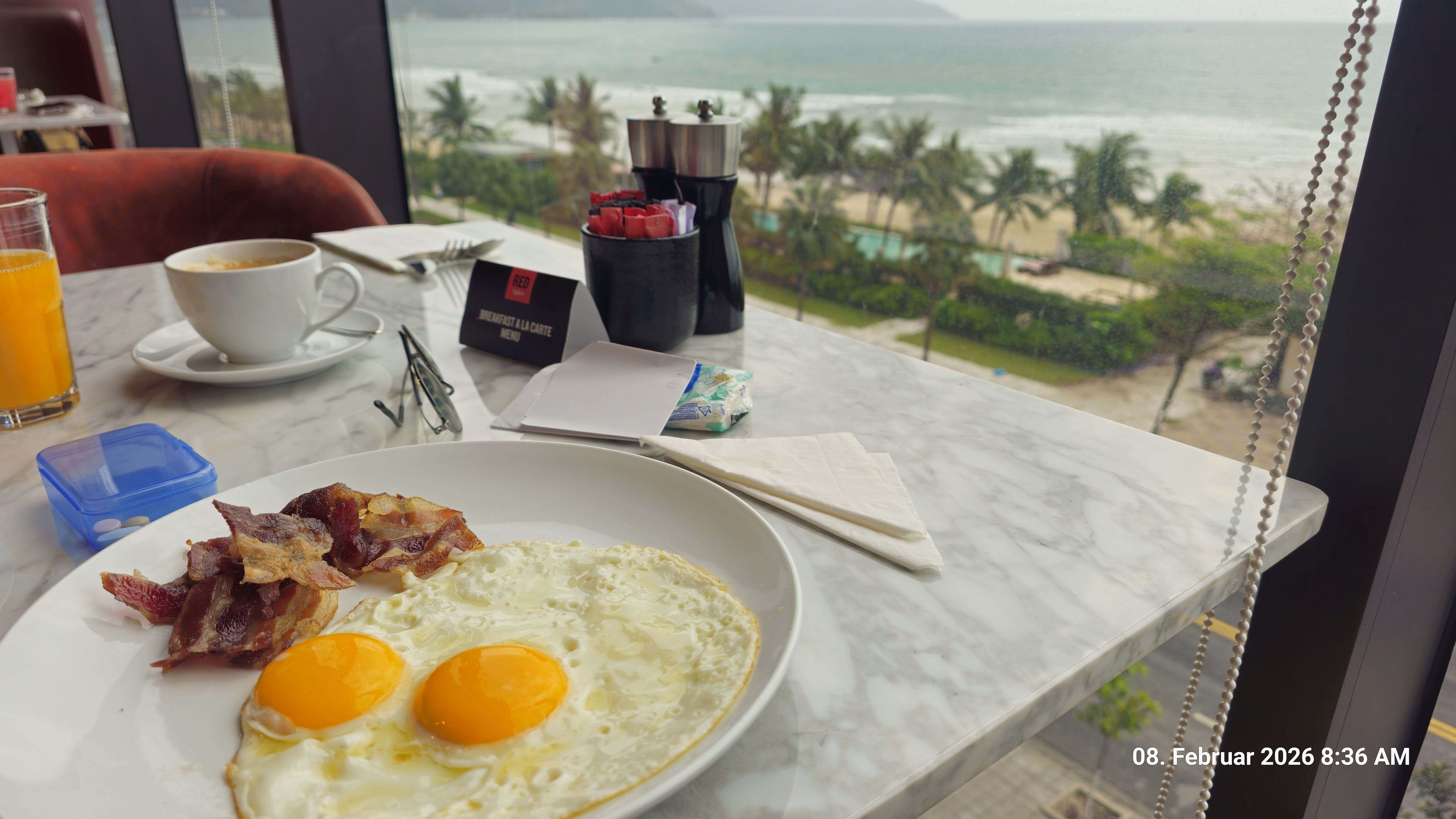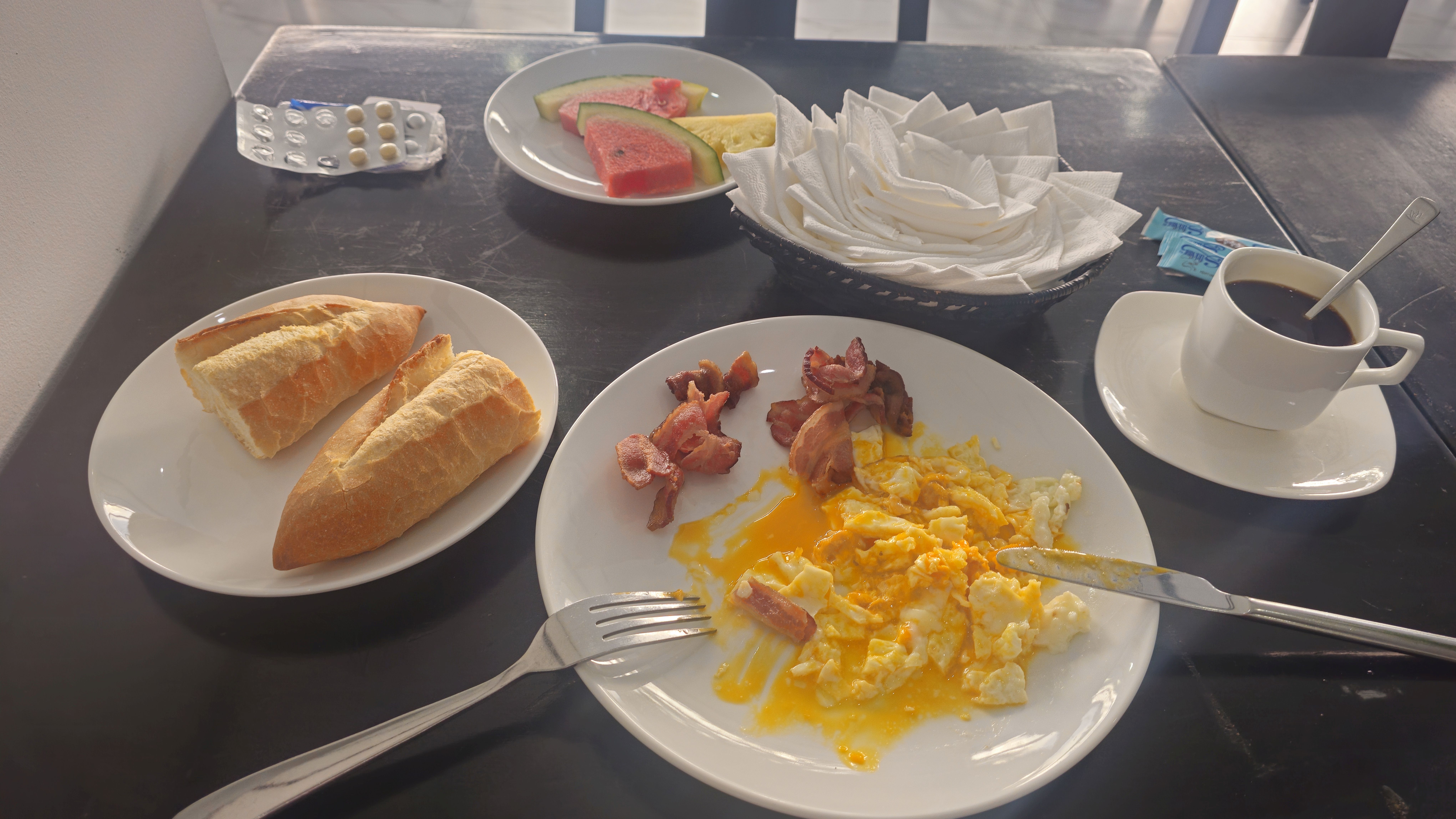Jetzt probierte ich den Cafe, also wirklich, der schmeckt nach dem Aufguss Cafe den ich schon von Thailand her kenne und hat mit einem guten Cafe nichts zu tun, und das im Land des zweitgrößten Cafe Produzenten der Welt. Der Cafe schmeckt also widerlich, so empfinde ich das. Und dann habe ich noch Wurst und den Käse probiert und mir auf einen Extra Teller etwas Wassermelone mit an meinem Frühstückstisch geholt. Nun habe ich mir noch ein kleines Glas Orangensaft geholt, das eher wie orangenzuckerwasser ausieht....und tasächlich es schmeckt mehr nach Zuckerwasser als nach Orange... eine komplette Enttäuschung. Das Buffet ist aber ziemlich groß, aber alles für die asiatischen Gäste zugeschnitten....die freuen sich bestimmt, denn das schaut alles sehr gut aus.